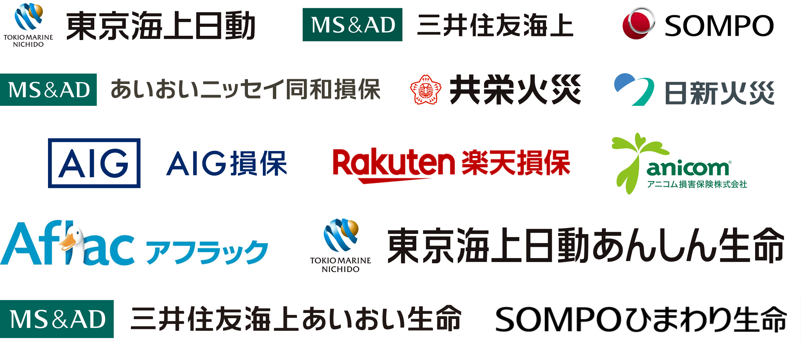 - 東京海上日動火災保険(株) 三井住友海上火災保険(株) 損害保険ジャパン(株) あいおいニッセイ同和損害保険(株) 共栄火災海上保険(株) 日新火災海上保険(株) AIG損害保険(株) 楽天損害保険(株) アニコム損害保険(株)